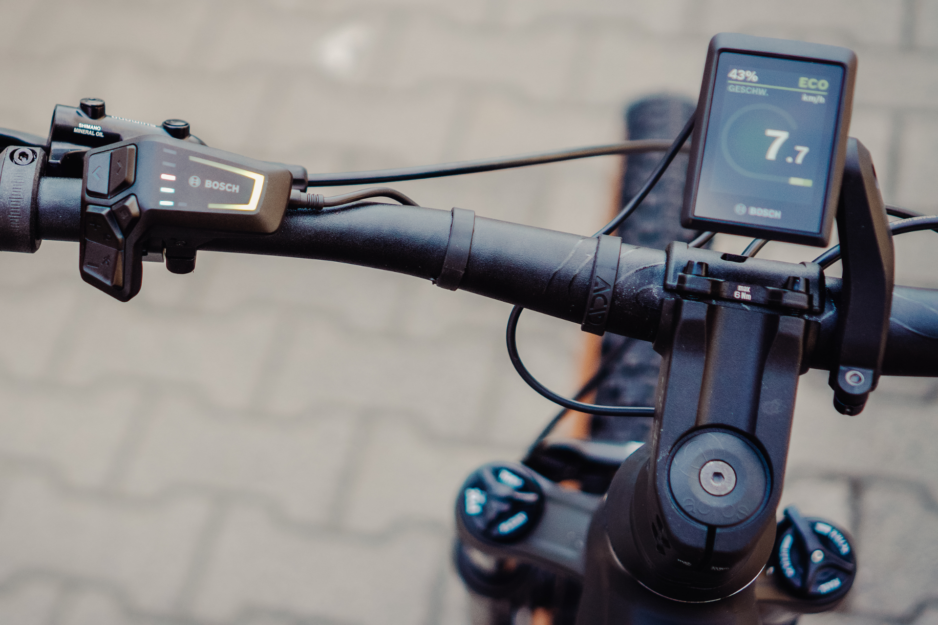 Moderne Bosch E-Bike Display-Technologie: LED-Remote-Kiox300 mit Navigationssystem auf einem Fahrradlenker.
