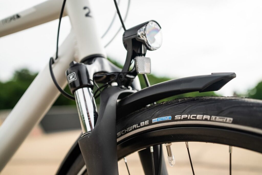 Das TRS24 steht auf „Schwalbe Spicer“-Reifen mit praktischen Reflexstreifen. Die Reifen bieten dank des geringen Gewichts und ihres glatten Profils ein sehr gutes Rollverhalten auf der Straße, sind aber weniger für abenteuerliche Trekkingtouren auf Waldwegen geeignet. Für zusätzlichen Komfort ist vorne Trekking-typisch eine Federgabel verbaut. Um die Räder zum Stillstand zu bringen, hat 2R Manufaktur ein Shimano-Bremssystem mit hydraulischen Scheibenbremsen gewählt, damit das Bremsen nicht nur bei schönem Wetter top funktioniert, sondern auch bei Regen bzw. nasser Fahrbahn zuverlässig klappt.