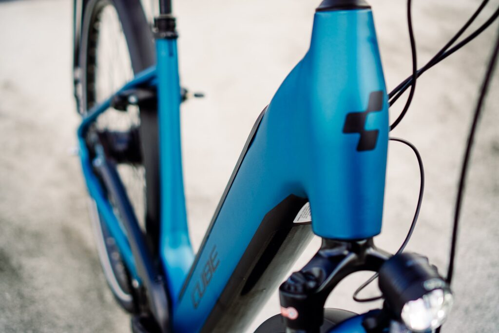 Der Rahmen mit Tiefeinstieg wird von Cube „Easy Entry“ und im Fachjargon „Wave“-Rahmen genannt. Im Lenkbereich ist der Rahmen schön hoch und ermöglicht eine sehr aufrechte Sitzposition. In der Mitte ist er dank des kompakten Bosch Active Line Plus Motors und integriertem Akku schön tief. Stichwort Akku: Der Bosch-Powertube ist mit 500 bis 625 Wattstunden (je nach Ausstattung) zwar überdurchschnittlich groß, lässt sich aber dank der cleveren Akkuklappe mit Schnellverschluss entspannt nach oben herausnehmen. Praktisch ist auch, dass das Schloss, das den Akku sichert, ganz oben liegt. Ein absoluter Vorteil beim Ein- und Ausbau des Akkus.