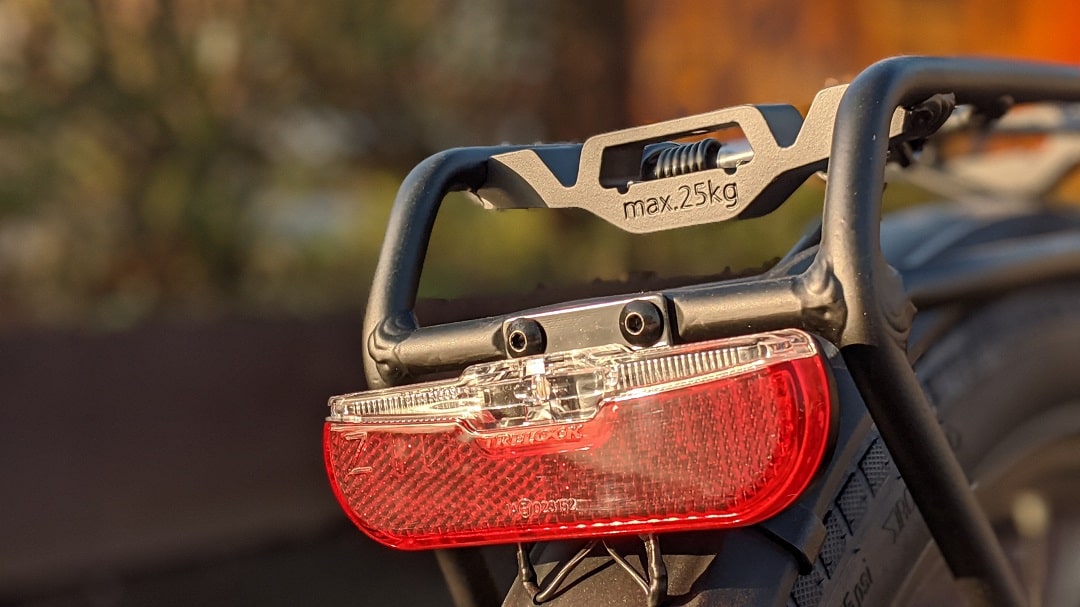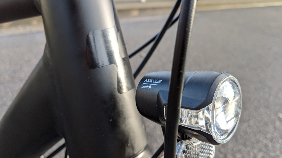 Cube stattet das Travel PRO mit einem 20 Lux starken Scheinwerfer von AXA aus, der per Nabendynamo angetrieben wird. Da ich das Rad tagsüber Probe fahre, kann ich die Beleuchtung nur in einer etwas dunklen Unterführung testen. Aber hier funktioniert alles perfekt. Das Rücklicht befindet sich am Gepäckträger und sorgt für eine gute Sichtbarkeit im Straßenverkehr. Um neben der Sichtbarkeit auch akustisch auf sich aufmerksam zu machen, liefert Cube das Travel PRO 2020, wie auch die Hyde Modelle, mit einer minimalistischen Knog Oi Klingel aus.