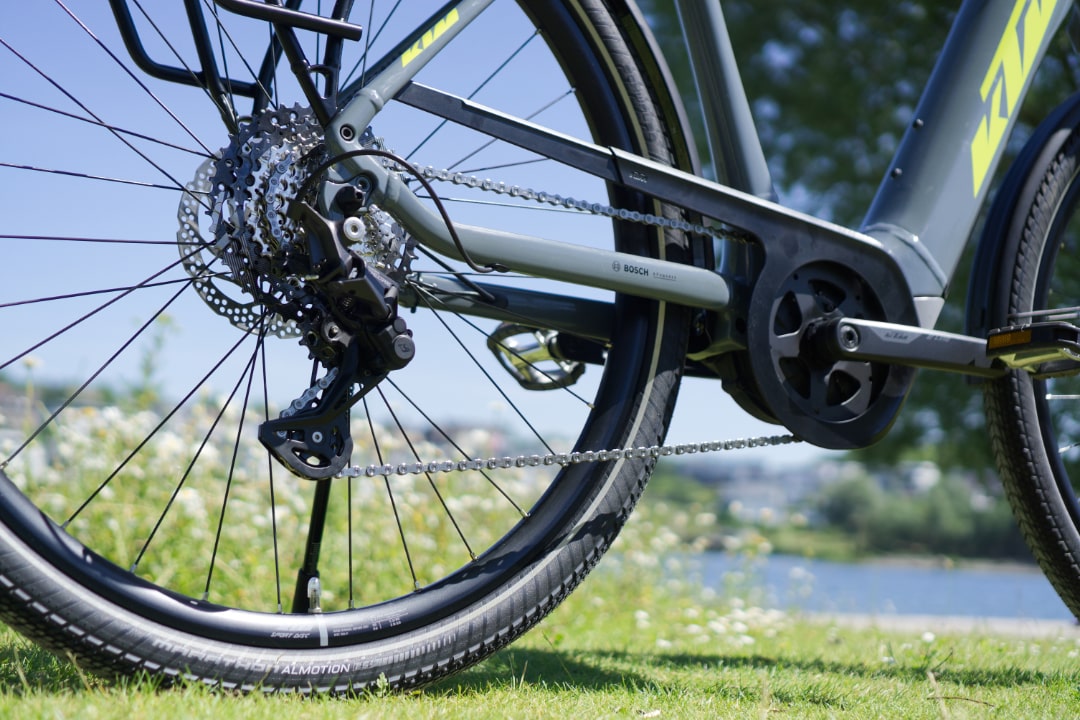Als nächstes springt mir die neuartige 10-Gang-Shimano.Linkglide-Schaltung im Heck des Bikes ins Auge. Die Kettenschaltung wurde speziell für E-Bikes entwickelt und sollte mit ihrer höheren Haltbarkeit besser zu den drehmomentstarken Motoren passen. Auch die Naben der Räder stammen aus der Shimano-Deore-Baugruppe, was bei einem hoch belasteten E-Bike ebenfalls von Vorteil ist. Die Shimano-Naben sind auf recht breite Felgen aufgespeicht, die ebenfalls sehr robust wirken. Auch die Marathon-Almotion-Reifen überzeugen mich, denn immerhin handelt es sich hier um einen der besten Trekking-E-Bike-Reifen von Schwalbe.