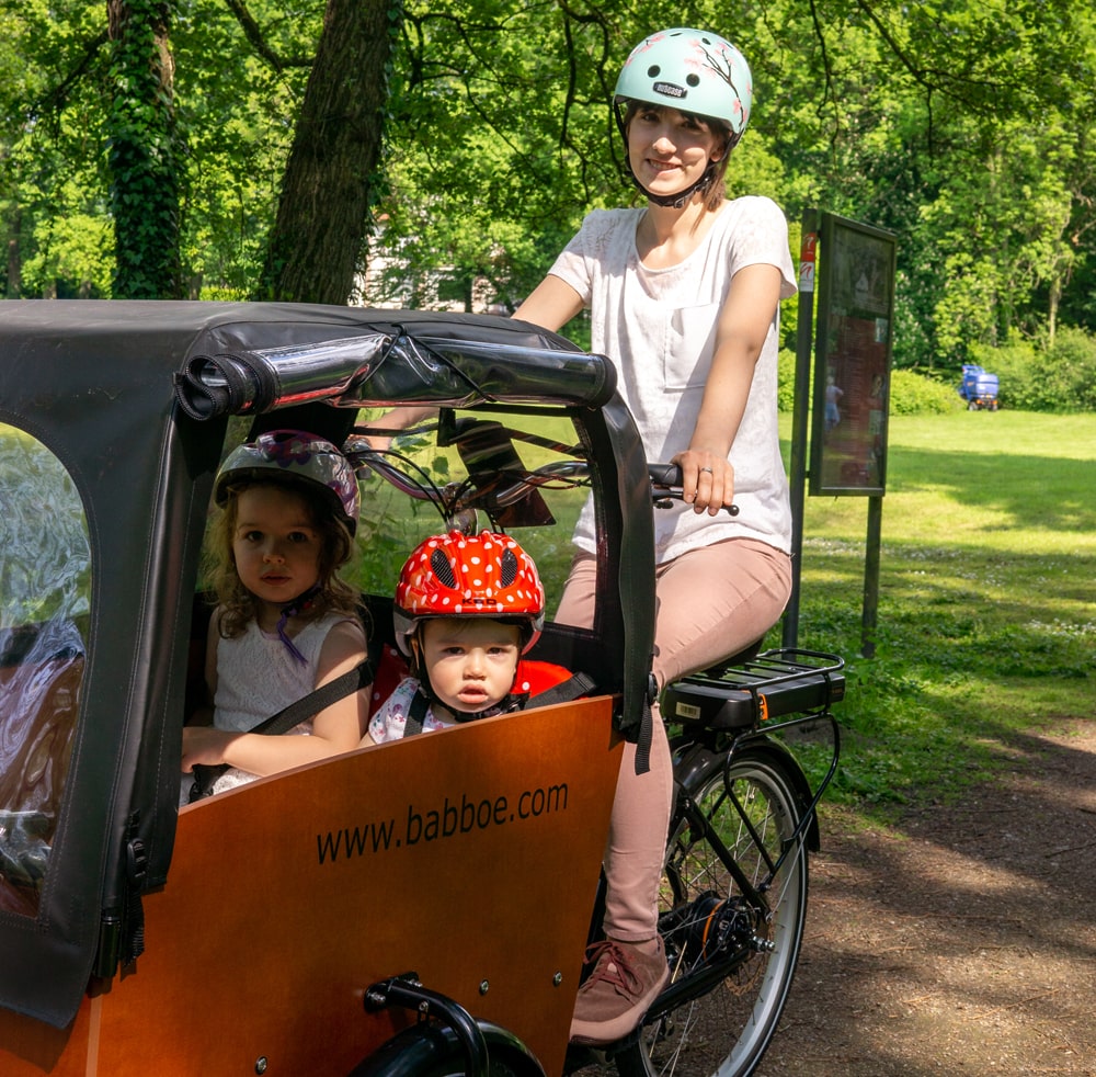 Getestet wurde das Babboe Big-E von Nicola: Sie ist Youtuberin und Mutter von zwei kleinen Kindern. Sie nutzt das Lastenrad seit dem Frühjahr 2019 als Autoersatz im städtischen Leben.