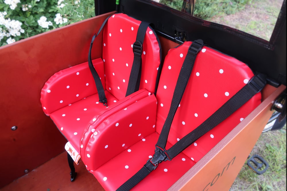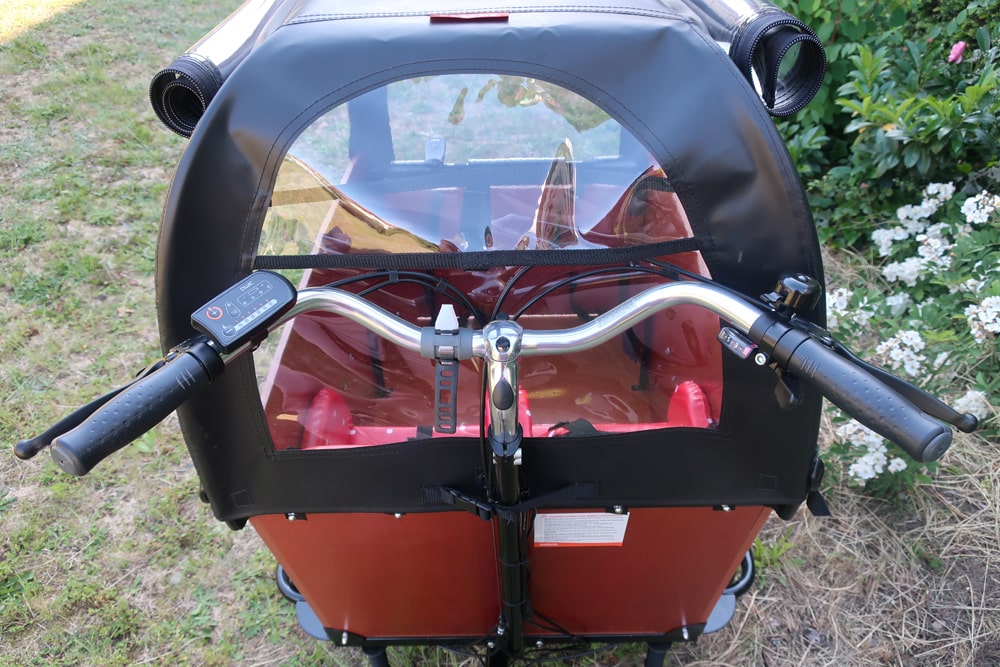 Das von Babboe erhältliche Zubehör ist passgenau auf das Lastenrad zugeschnitten und ebenso hochwertig verarbeitet. Ein „Must-Have“ ist meiner Meinung nach das Regendach, welches die wertvolle Fracht in der Transportbox des Lastenfahrrads nicht nur vor Regen, sondern auch vor Wind, Kälte und Insekten schützt. Rollt man die beiden Seiten ganz hoch, kann sich auch an sonnigen Tagen keine Hitze anstauen. Für zusätzlichen Komfort haben wir in der Transportbox des Babboe Big-E zwei gepolsterte Kindersitze nebeneinander in Fahrtrichtung angebracht. Die Armlehnen geben meiner einjährigen Tochter noch etwas zusätzliche Stabilität. Für ältere Kinder kann man auch durchgängige Bankpolster einsetzen, sodass sie etwas mehr Platz haben. Das spezielle Zubehör für den Transport von kleineren Babys konnte ich bisher leider noch nicht testen. Ich kann nur sagen, dass meine Kinder auf schlechten Wegen ordentlich durchgerüttelt werden (worüber sie sich nie beklagt haben, sie finden es eher lustig). Ich persönlich würde daher ein kleines Baby wohl nur auf wirklich guten Straßen mitnehmen und entsprechend umsichtig fahren.