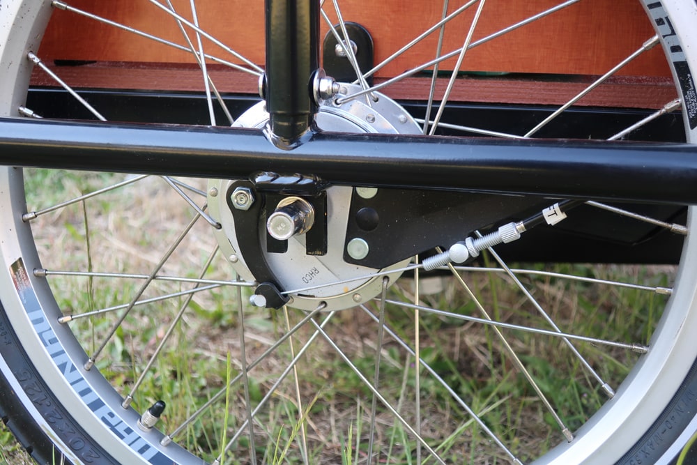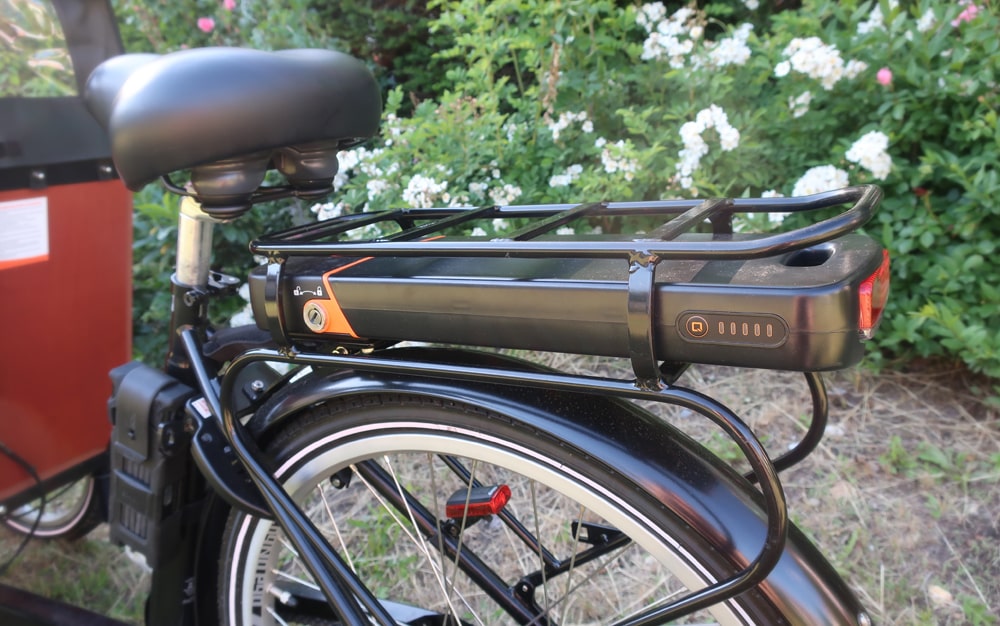 Die Shimano Rollenbremse am Hinterrad und die Trommelbremsen an den beiden Vorderrädern bremsen das Rad problemlos ab, auch wenn es maximal beladen ist. Der 36V Qwic Lithium-Ionen-Akku ist im Gepäckträger verbaut und kann durch Abschließen vor Diebstahl gesichert werden. Die mitgelieferte Lichtanlage habe ich nie kennengelernt, da sie von dem Lucky Bike Mitarbeiter bei Abholung bereits gegen ein stärkeres batteriebetriebenes Set ausgetauscht wurde.