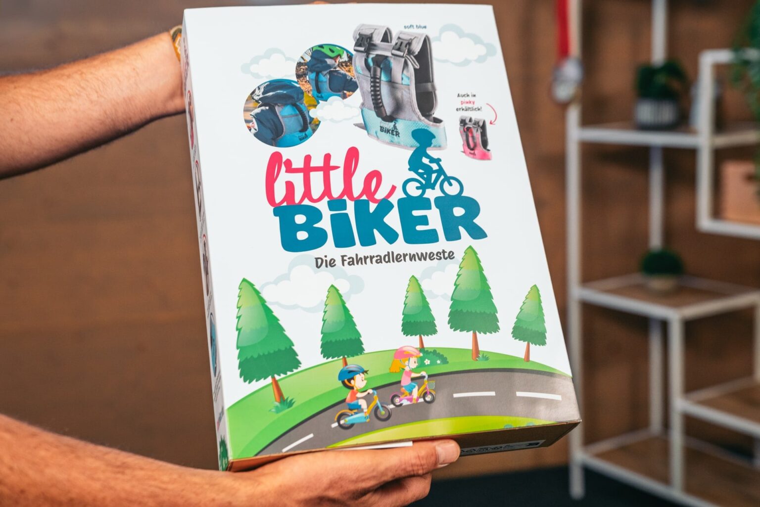 Als die Little Biker Weste bei mir ankam, war ich zunächst überrascht, wie hübsch sie verpackt war. Auf den ersten Blick wirkt sie fast wie ein Kinderbuch. Nach dem Auspacken lag eine leuchtend rosa Weste vor uns – die Farbe ist wirklich knallig und sorgt definitiv für gute Sichtbarkeit. Alternativ gibt es auch die Farbe „Soft Blue“.