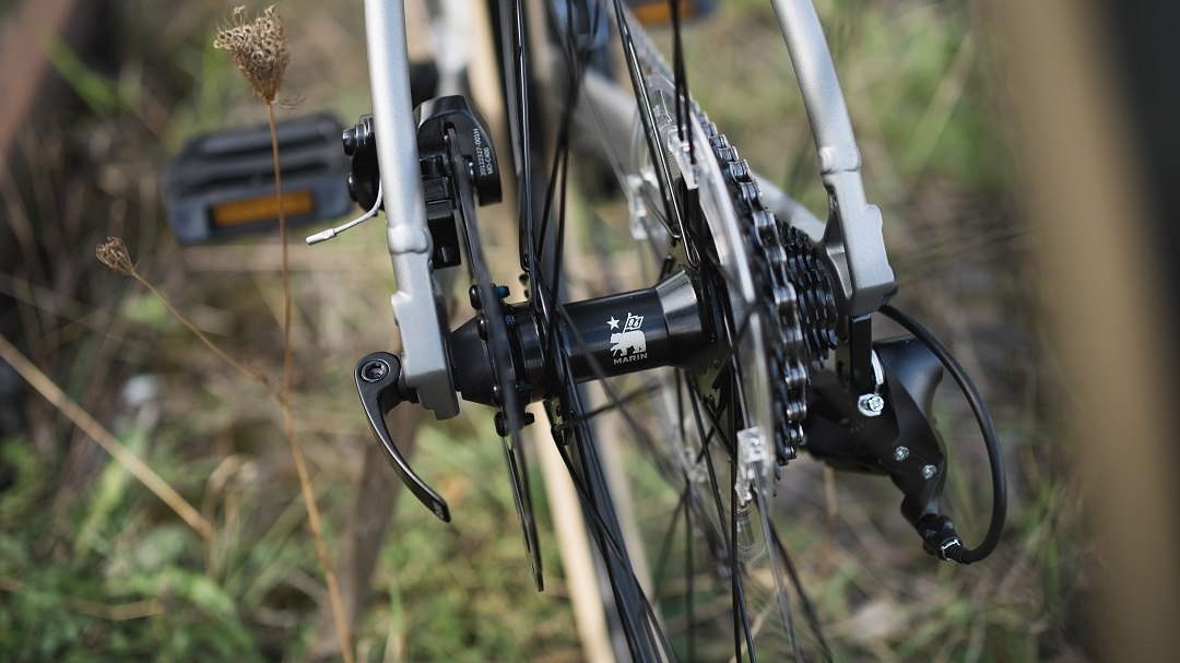 Schaltwerk des Marin Lombard 1 2023, Nahaufnahme mit Fokus auf Kettenschaltung und Hinterrad im Freien.