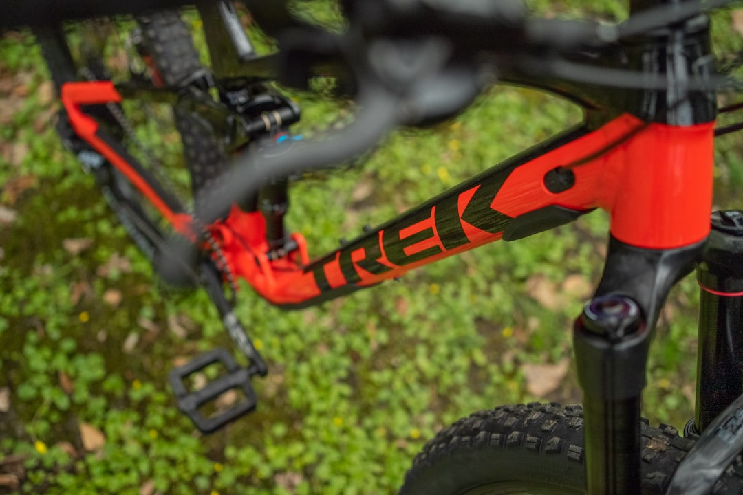 Der vollgefederte Rahmen mit seinem markanten Unterrohr und dem plakativen „TREK“-Schriftzug ist zwar schon seit einigen Jahren der Standard, dennoch überzeugt mich das Design jedes Mal aufs Neue. Als Trek-Fan wird es mir zugegebenermaßen etwas schwer fallen hier objektiv zu bleiben. Mit der Kombination aus schwarz mit knalligem Rot – das Trek passenderweise als „radioactive red“ bezeichnet – erinnert mich das Bike an einen Rennwagen. Alternativ gibt es das Fuel EX 7 in einem ebenfalls gelungenen Farbschema in schwarz mit türkiser Akzentfarbe. Neben der Lackierung wirkt auch die Verarbeitungsqualität des Rahmens gewohnt hochwertig. Die Schweißnähte sind sehr dezent und runden den hochwertigen Gesamteindruck ab.