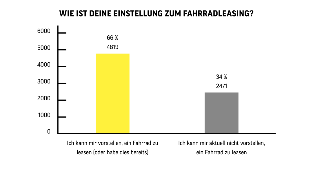 Unsere Umfrage zum Thema Fahrradleasing wurde im Juni 2021 veröffentlicht und war über unsere Website sowie unsere Social Media-Kanäle verfügbar. Die erste Frage konzentrierte sich auf das grundsätzliche Interesse, ein Fahrrad zu leasen. Dabei gaben knapp 5.000 der 7.290 Teilnehmerinnen und Teilnehmer an, bereits ein Fahrrad zu leasen oder sich vorstellen zu können, dies zukünftig zu tun. Spannend, wie wir finden!