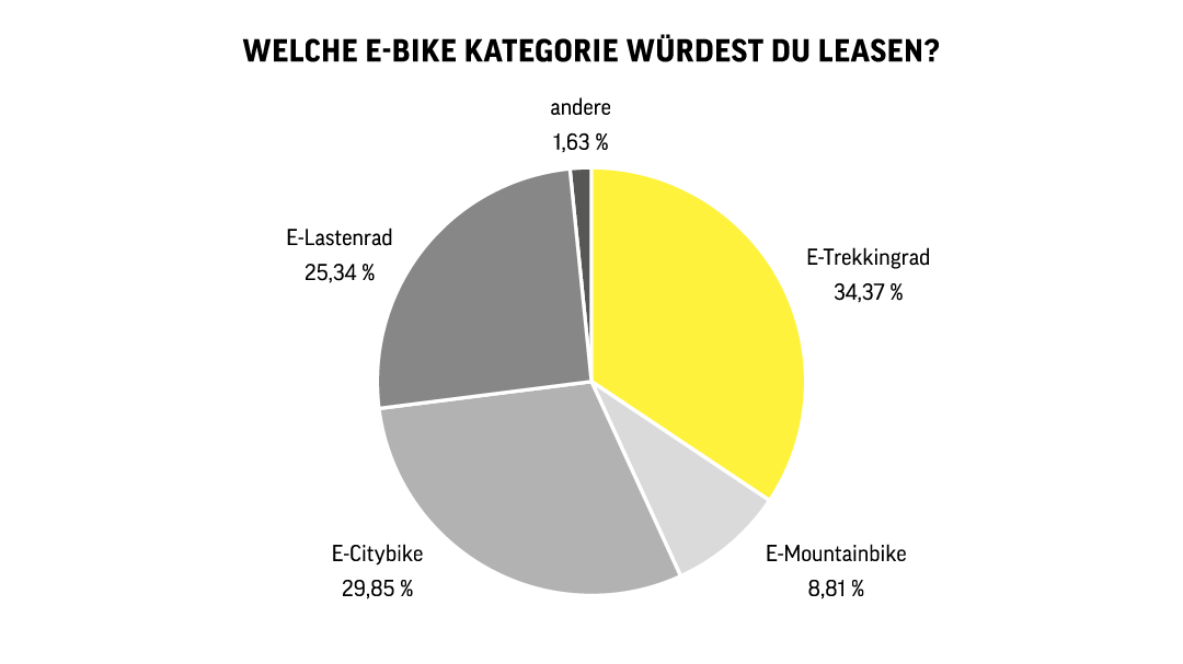 Die Antwort zur ersten Frage ist eindeutig: Rund 94 Prozent der Befragten geben an, dass ein E-Bike das Rad ihrer Wahl wäre. Da E-Bikes in der Anschaffung meist höherpreisiger sind als Fahrräder ohne elektrische Unterstützung, leuchtet dieses Ergebnis ein. Die drei beliebtesten E-Bike-Kategorien sind: E-Trekkingrad, E-Citybike und E-Lastenrad.